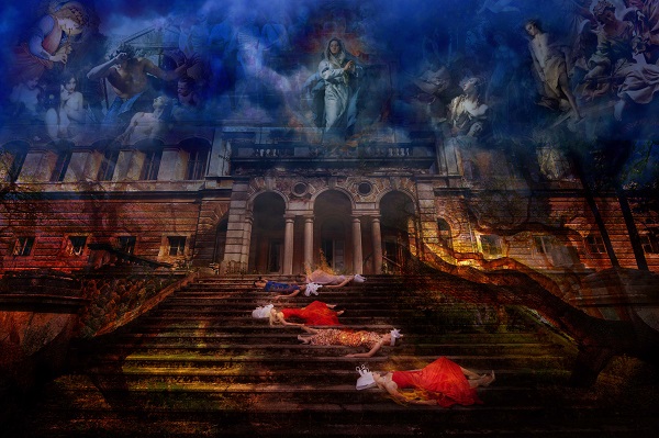 Ancora due campi d’azione sono stati esplorati da questo poliedrico artista. La Moda, per la quale Maniscalchi ha condotto importanti campagne pubblicitarie e d’immagine, appare in mostra con una sfilata. Sfilata di moda della stilista russa Olga Rusakova, strettamente collegata all’artista da un gioco incrociato di creatività: la stilista ispira le foto con i suoi abiti dalle scenografiche acconciature per la testa, indossati con collane ricche di abbaglianti colori, e il fotografo le trasforma in altro con ambientazioni fra l’infernale ed il serafico.