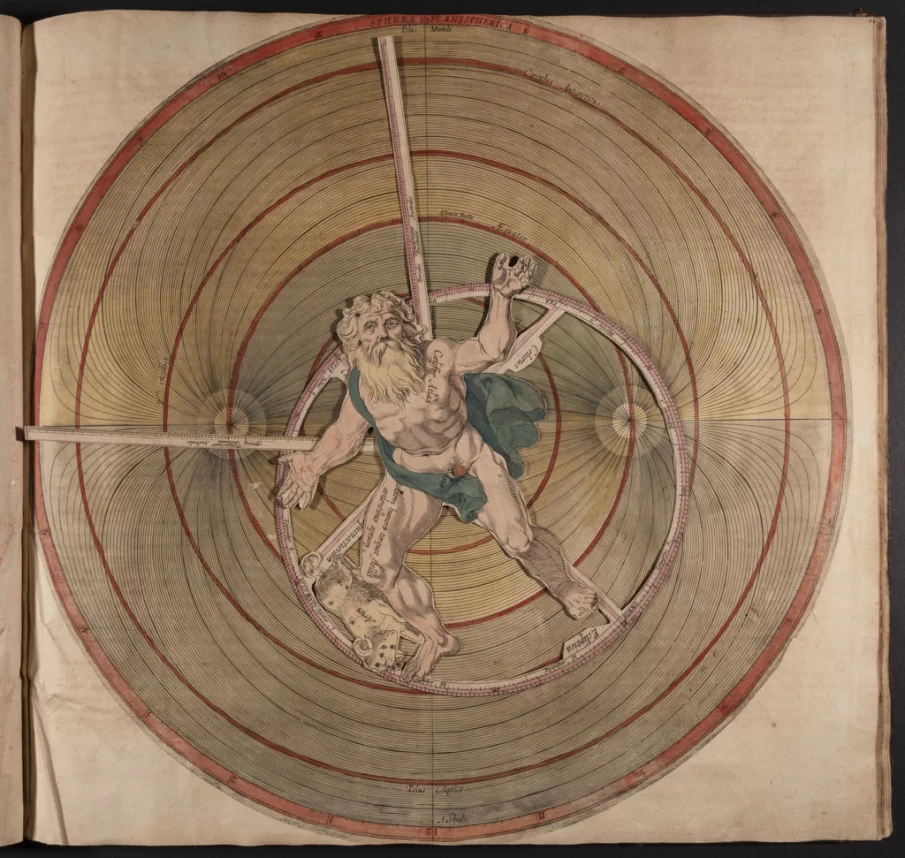 Tra gli oggetti più significativi in mostra, la Mano che scrive, automa ideato da Friedrich von Knauss (datato 1764), il primo in grado di scrivere grazie a un sofisticato meccanismo d’orologeria; il celebre Dialogo sopra i due massimi sistemi del mondo tolemaico e copernicano di Galileo Galilei (1632), l’opera che costò allo scienziato il processo per eresia; la spettacolare Astrologia, seu motus et loca siderum di Ottavio Pisani (1613), un “libro animato” ricco di tavole mobili colorate a mano che illustrano la struttura dei cieli e il moto dei pianeti. Ancora, l’Atlante nautico del Mar Mediterraneo, del Mare del Nord e degli oceani Atlantico, Pacifico e Indiano di Giovanni Oliva (1616), opera che testimonia l’interesse dei Medici per l’esplorazione oceanica e il commercio marittimo, e il volume Della trasportatione dell’obelisco vaticano di Domenico Fontana (Roma, 1590), in cui si illustra il progetto per spostare l’obelisco egizio, in origine sul lato sinistro di San Pietro a Roma, davanti alla facciata della basilica.