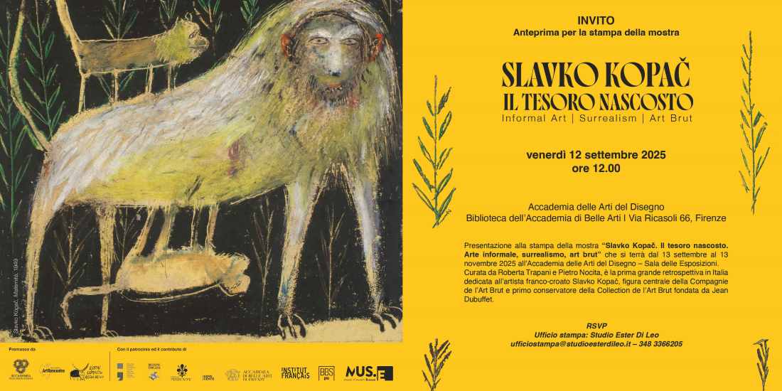 ArtRencontre è un’associazione senza scopo di lucro dedicata alla promozione dell’istruzione, della cultura e dell’arte. La parola “rencontre” (incontro) descrive al meglio l’incontro tra l’arte, le opere d’arte e il pubblico. L’obiettivo principale dell’associazione è lo sviluppo e la promozione del patrimonio culturale tangibile e intangibile. L’eredità del pittore Slavko Kopač è al centro degli interessi e delle attività dell’associazione, e tutte le azioni sono condotte con lo scopo della sua affermazione e promozione a livello internazionale. L’Accademia delle Arti del Disegno, presieduta dalla prof.ssa Cristina Acidini, è una Accademia di Alta Cultura, prima accademia d’arte pubblica fondata nel mondo occidentale, con oltre 450 anni di vita attiva a Firenze. L’Accademia è un istituto riconosciuto di rilevanza nazionale e internazionale dal Ministero della Cultura della Repubblica Italiana. Studio, conservazione e valorizzazione del patrimonio culturale sono gli i principali ambiti della sua attività che con le sue collezioni, archivi, biblioteche e con i suoi 500 accademici provenienti da ogni parte del mondo è riconosciuta centro internazionale di dialogo e promozione culturale. La mostra, realizzata con il patrocinio del Ministero della Cultura croato, della Regione Toscana e del Comune di Firenze, è promossa e organizzata dall’Accademia delle Arti del Disegno, da ArtRencontre e dalla Kopač Committee Association, in collaborazione con Museo Novecento Firenze, Accademia di Belle Arti di Firenze, Institut Français Firenze, BBS Pro e MUS.E Firenze. Curata da Roberta Trapani e Pietro Nocita Comitato scientifico: Fabrice Flahutez, Pauline Goutain, Roberta Serpolli In collaborazione con Kopac Committee Association Progetto espositivo di Francesca Fornasari Progettazione grafica di Chiara Scordato Assistente alla produzione Isabella Trapani Social Media Manager Monica Scordato Promossa da Artrencontre SLAVKO KOPAČ. Il tesoro nascosto. Arte informale, surrealismo, art brut Firenze, 13 settembre – 13 novembre 2025 Accademia delle Arti del Disegno | Sala delle Esposizioni Via Ricasoli 68, Firenze