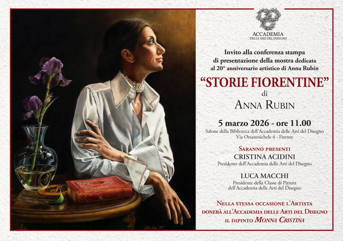 Dal 6 marzo fino al 3 aprile, 12 opere pittoriche dell’Artista saranno in esposizione nell’accademia di belle arti più antica del mondo, in via Orsanmichele 4, e per l’occasione vi sarà in mostra anche Monna Cristina, il ritratto che nel 2021 Anna Rubin fece di Cristina Manetti – attuale Assessore alla cultura della Regione Toscana – che sarà donato all’Accademia delle Arti del Disegno di Firenze la mattina di giovedì 5 marzo alle 11, quando la mostra sarà presentata ai media alle, alla presenza della Presidente Cristina Acidini, del Presidente della classe di pittura dell’Accademia, Luca Macchi, e dell’Artista. |